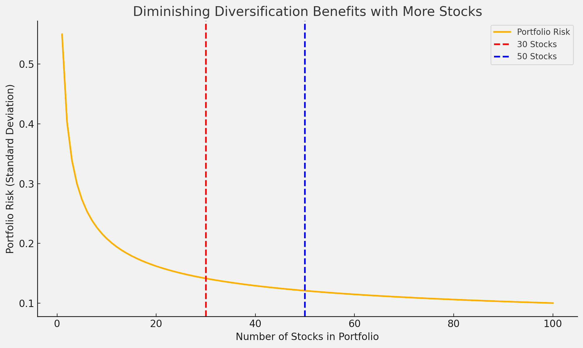 It’s important to note that the benefits of diversification diminish rapidly after a certain point. Studies show that the marginal benefit of adding more stocks drops significantly after about 30 to 50 holdings (Evans and Archer 1968). Owning more than one fund doesn’t automatically reduce your risk, especially if those additional funds are highly correlated with the first.