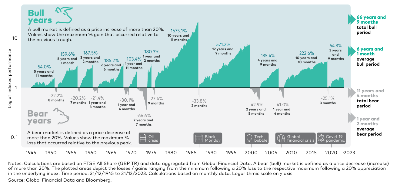 Vanguard. 2025. Bull and Bear Markets Over Time (UK version; FTSE All Share GBP TR, monthly data, 31/12/1945 to 31/12/2023). Vanguard calculations using Global Financial Data and Bloomberg.